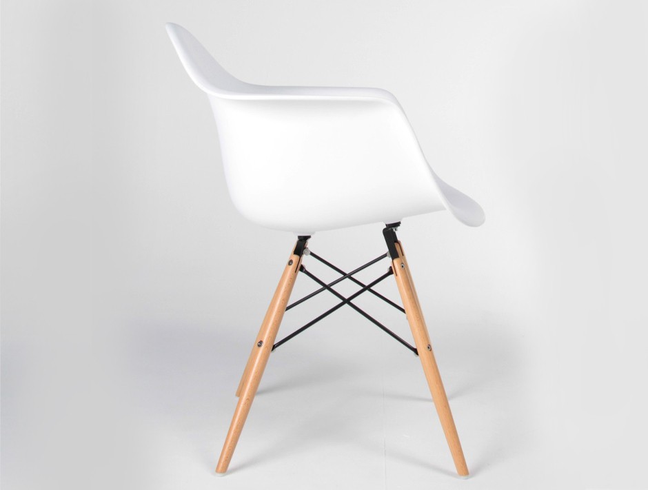 Our white version stays true to the original proportions. The integrated armrests sit at exactly the right height for relaxed meals, and the beech wood dowel base brings natural warmth to the crisp white shell — a balance the Eames duo themselves would have appreciated. If you love the broader Eames legacy, our Eames lounge chair replica and Eames LCW chair replica complete the picture beautifully.