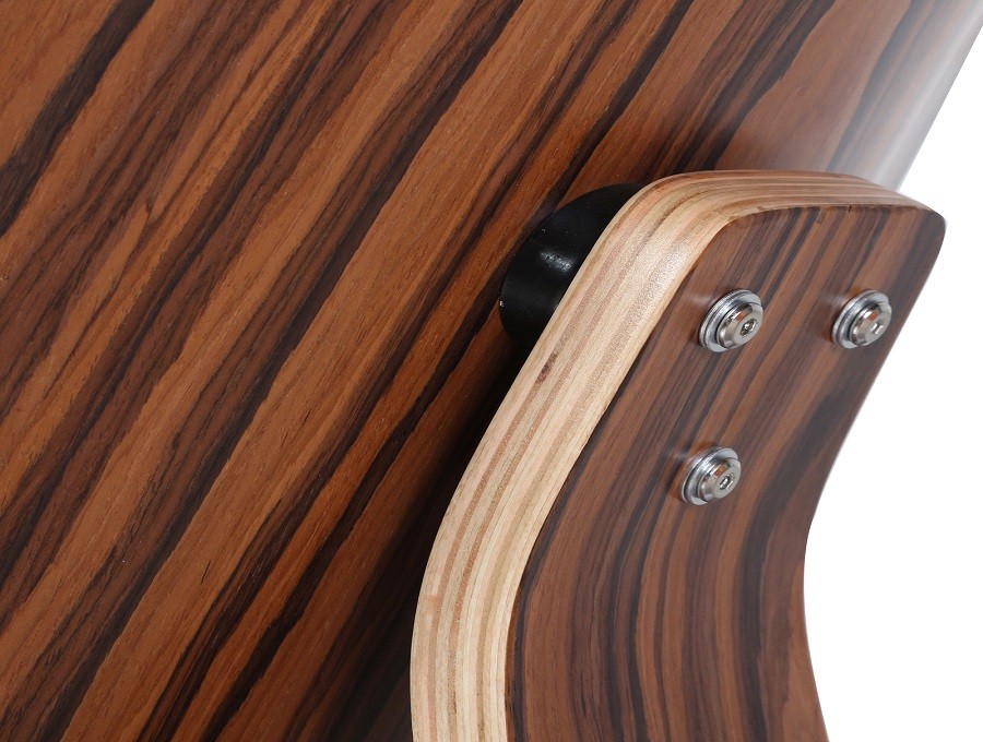 Santos palisander — a sustainable rosewood-family timber that is CITES-compliant and visually nearly identical to real rosewood. The same choice used by licensed manufacturers.