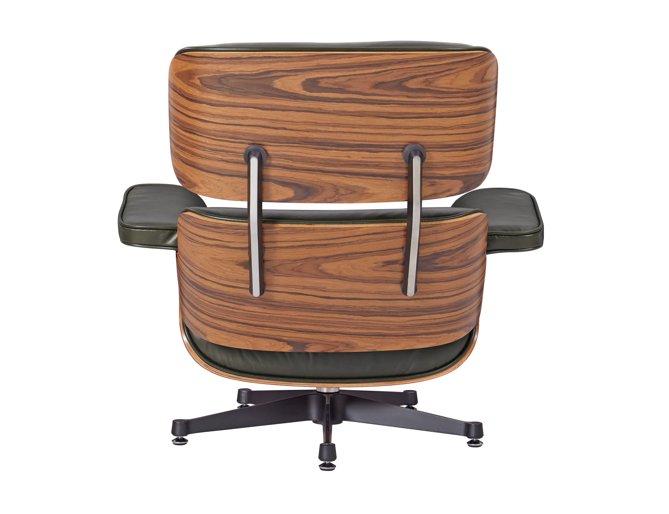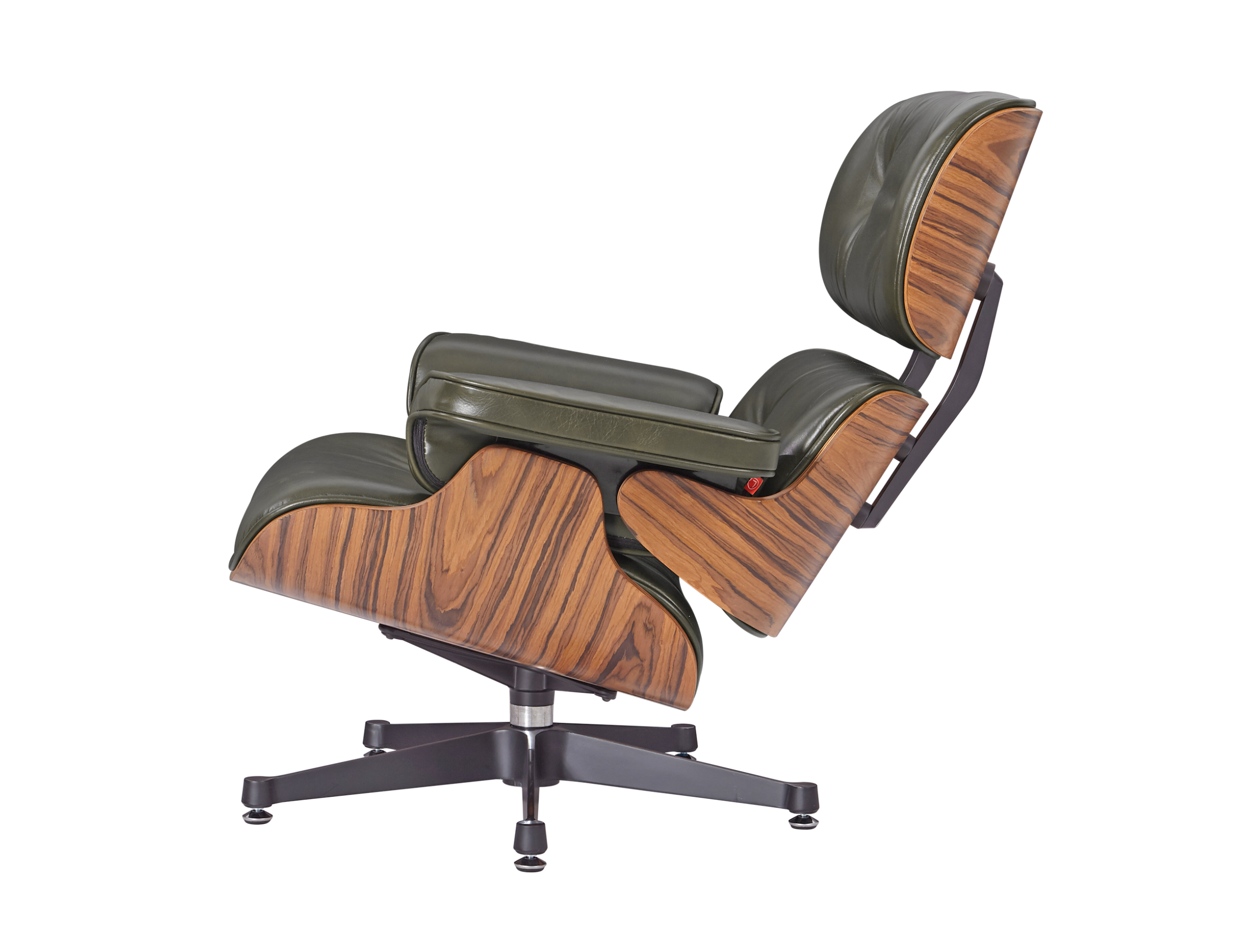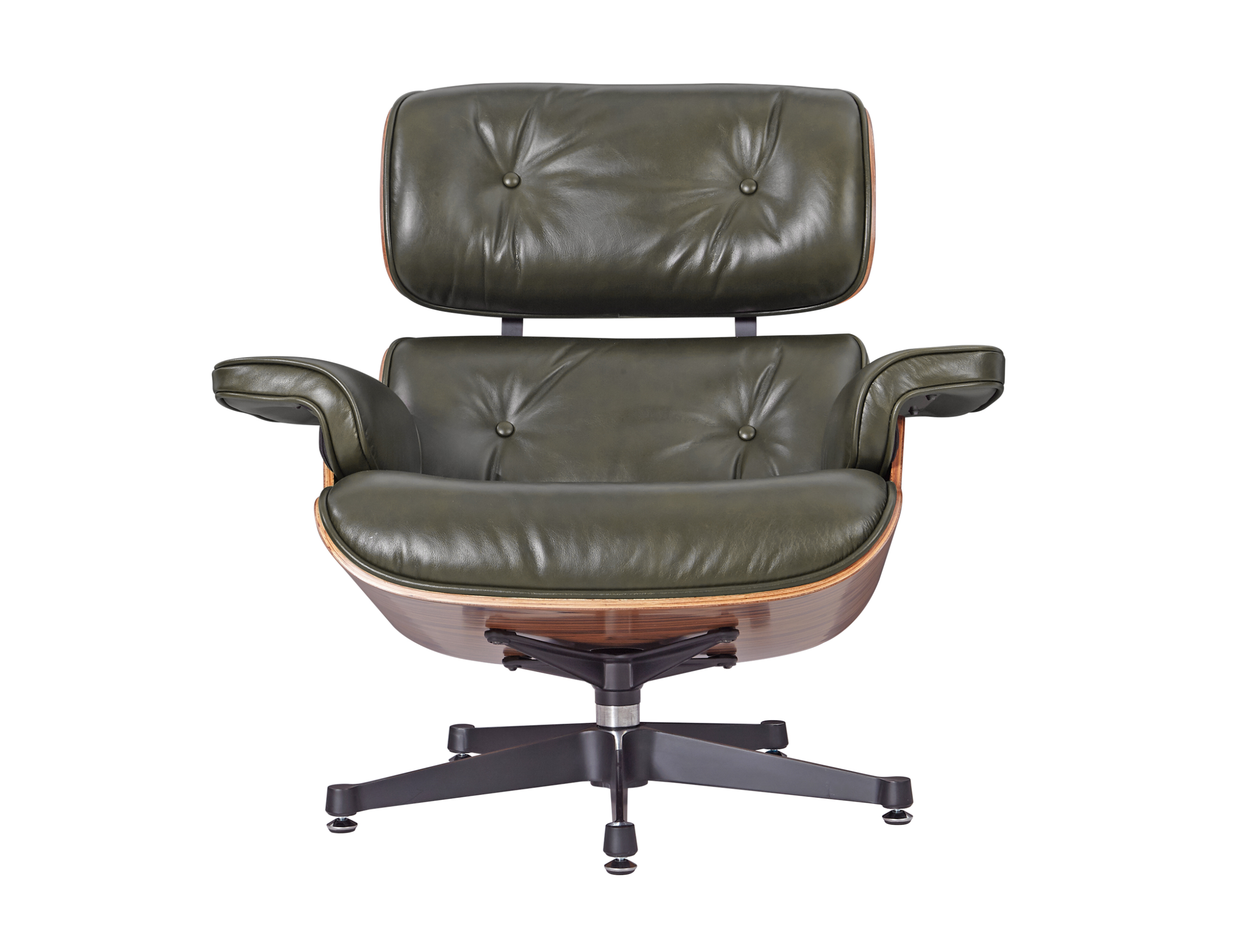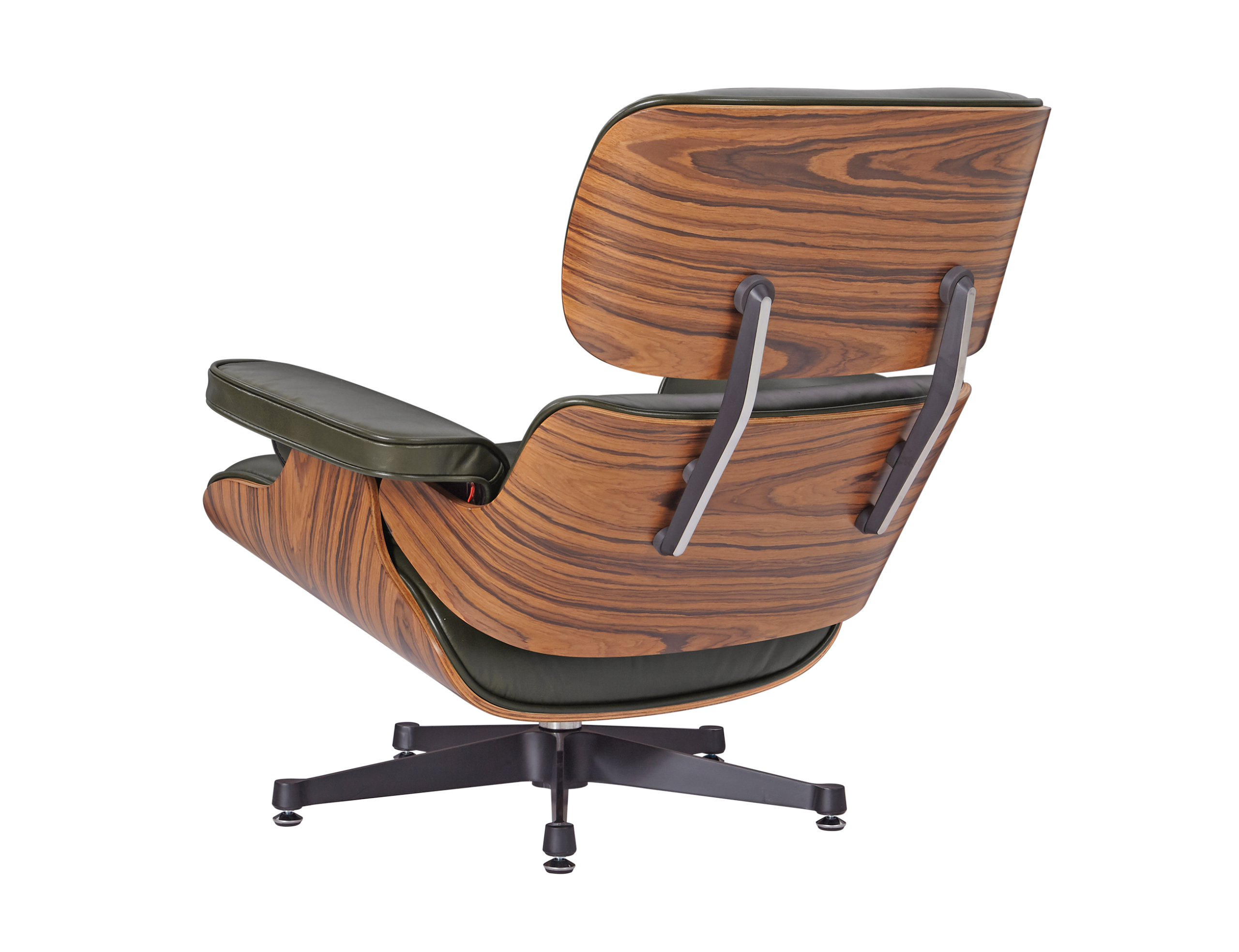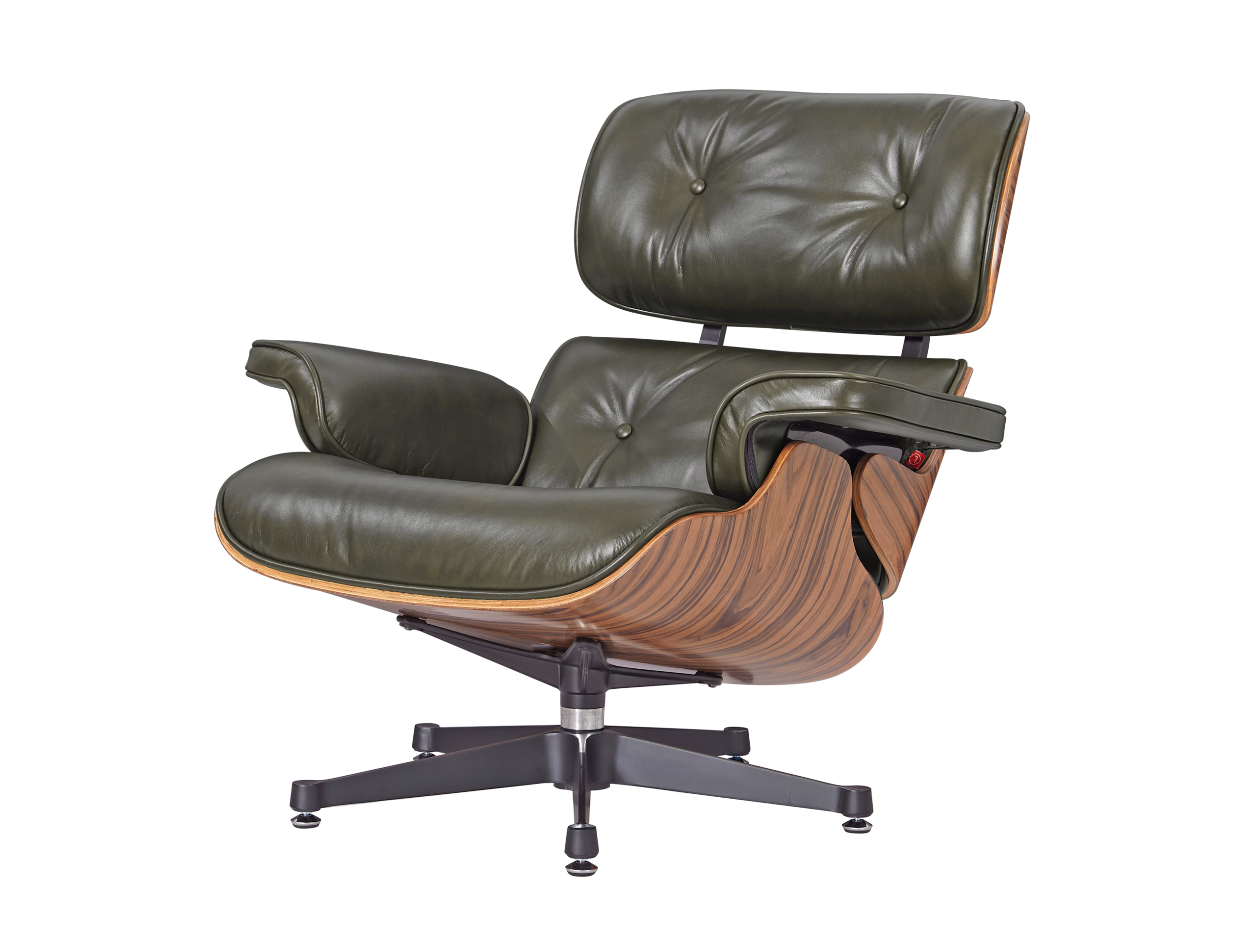 Our Eames style lounge chair and ottoman in olive green leather brings that classic mid-century feel to your home. The waxy olive green Italian aniline leather cushions have a soft, slightly shiny look, paired with polished rose wood veneer shells and a sturdy aluminium base – great for relaxing in modern European homes or apartments.