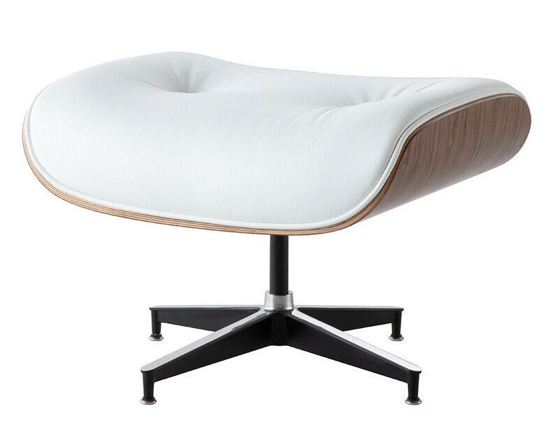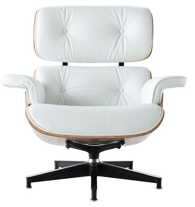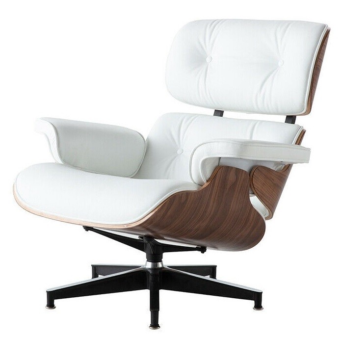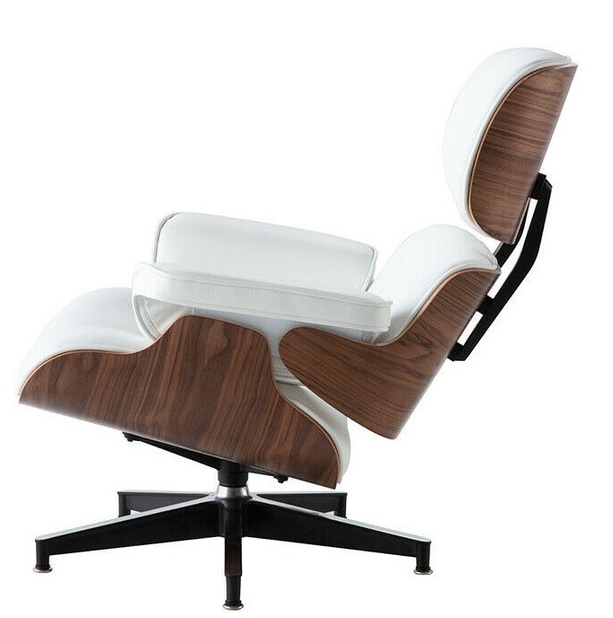 This Eames Style Lounge Chair and Ottoman brings timeless mid-century elegance to your living space right away. The premium white Italian aniline leather looks fresh and inviting, with polished walnut veneer shells and a die-cast aluminium base – perfect for relaxing in modern European homes or adding luxury to your lounge area.