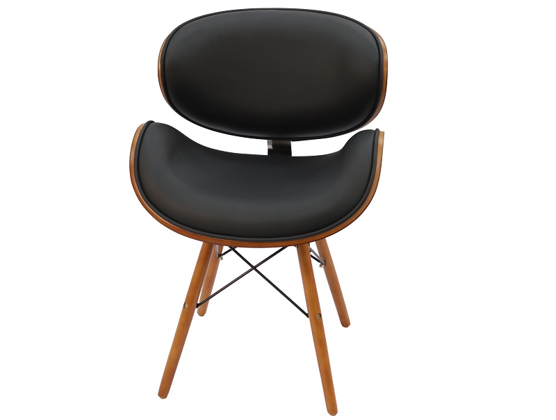 The seat pan and backrest are shaped from curved bentwood plywood, not flat injection-moulded plastic. The walnut-tone finish on the outer back of the shell and the underside of the seat is real wood grain — not printed laminate. When someone sits down and looks at the back of the chair from across the table, they see a warm, sweeping curve of walnut wood. When they sit in it, they feel a generously padded black faux leather surface shaped to support the natural curve of the back.